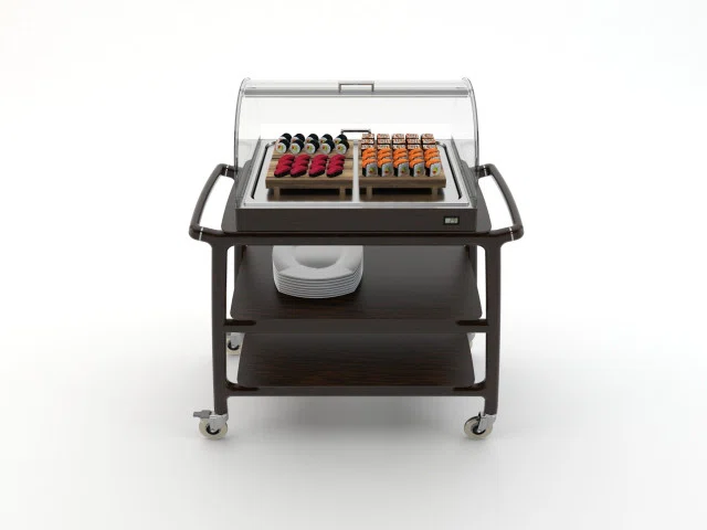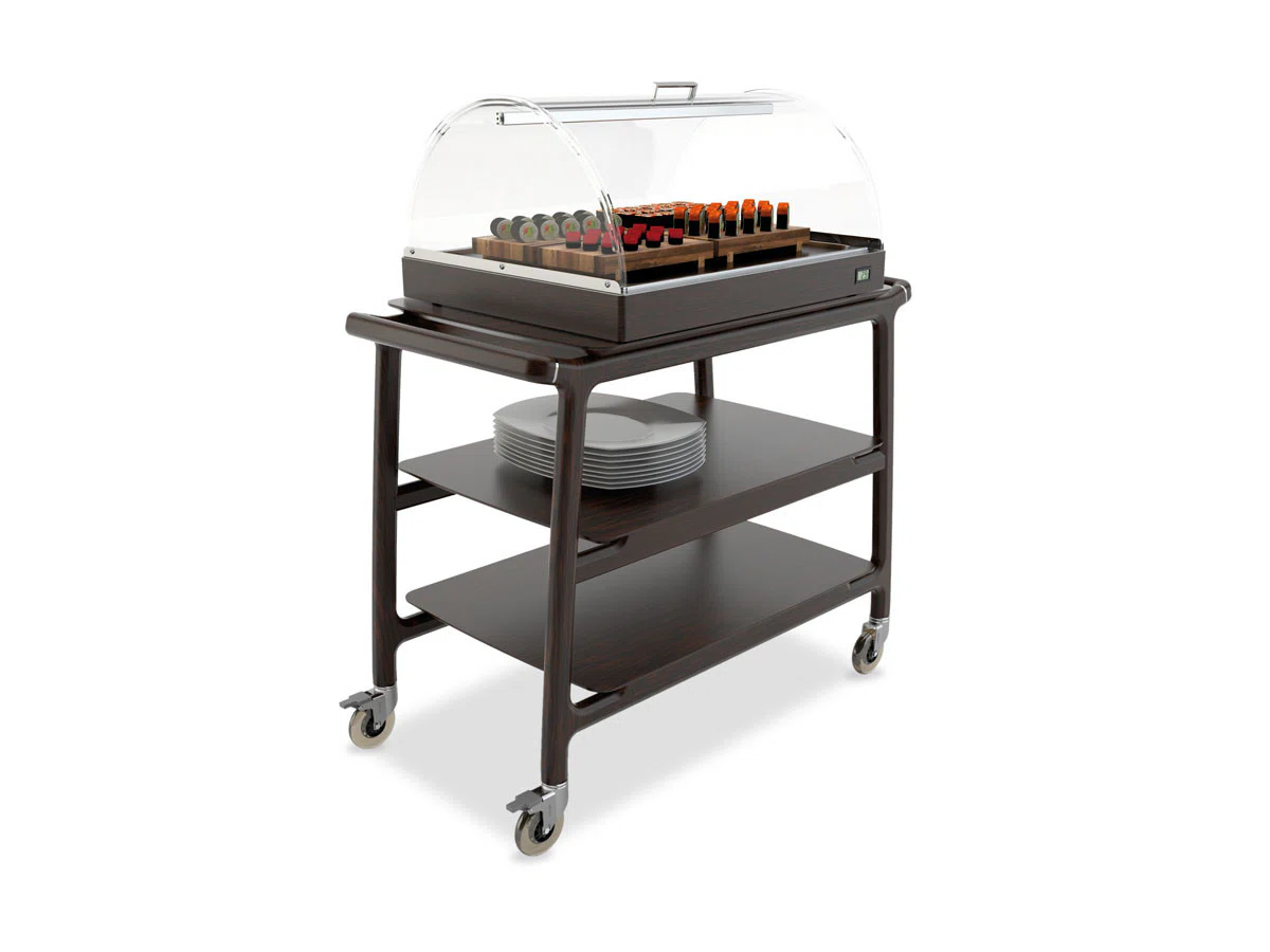 Vacker serveringsvagn med 3 hyllor och kyld ”displaymonter”.