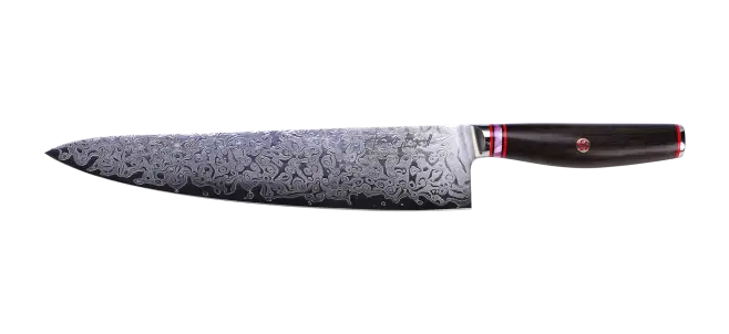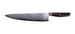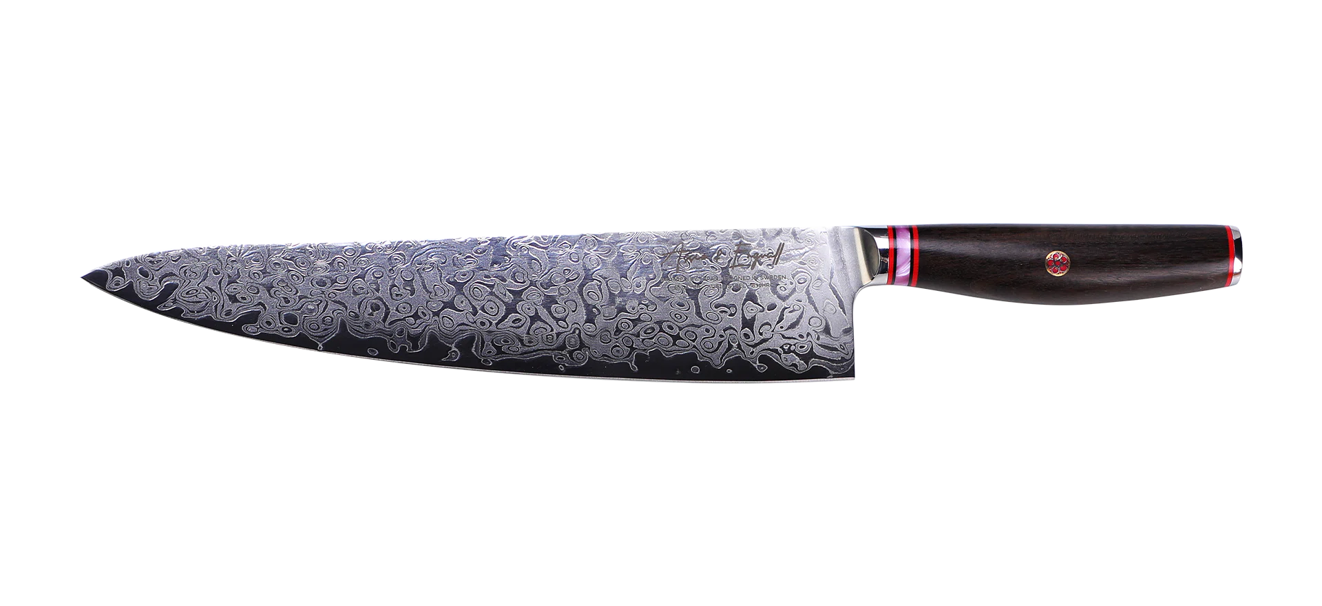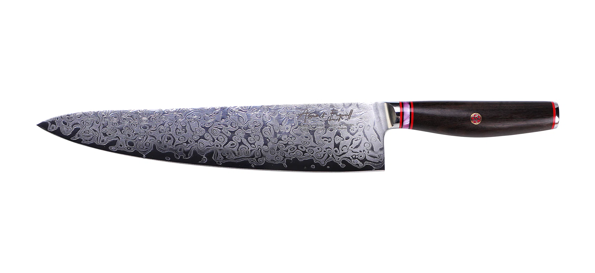 Kniven har ett 24 cm långt blad, prytt av ett elegant damaskusmönster med 45 lager stål.