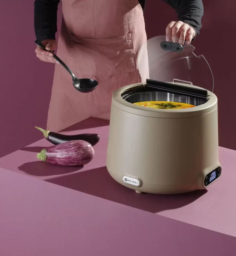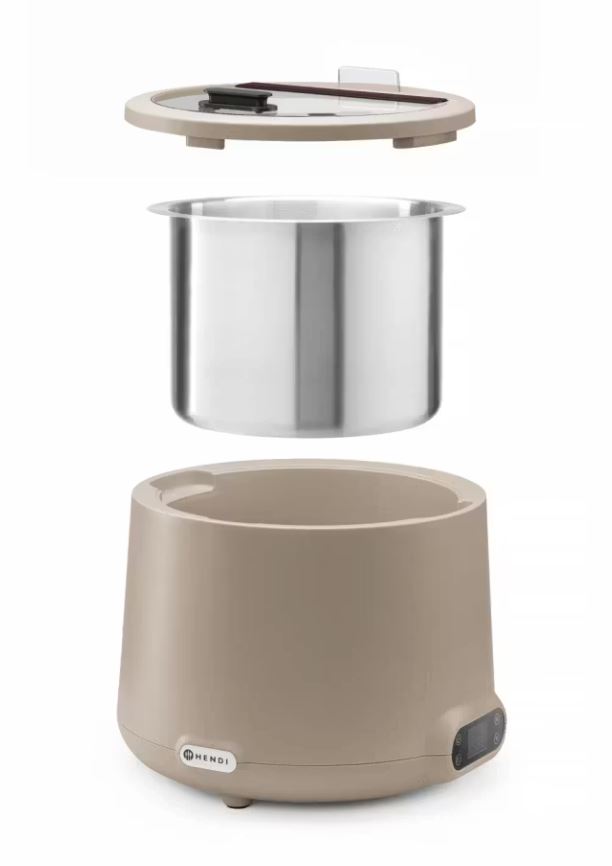 Soppvärmare Uniq Hendi i beige är en professionell soppvärmare med 8 liters kapacitet, perfekt för restauranger, bufféer och catering. Med digital temperaturkontroll (35–85 °C), avtagbar rostfri behållare och smart design håller den maten varm, fräsch och hygienisk under servering. Stilren, slitstark och enkel att använda – ett självklart val för restauranger.