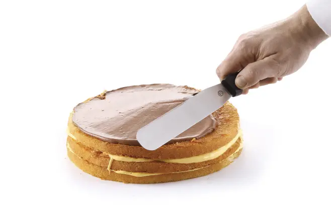 Följsam och flexibel spatel i rostfrittstål och plasthandtag, optimal för konditoriva ämnen som ska bres på.