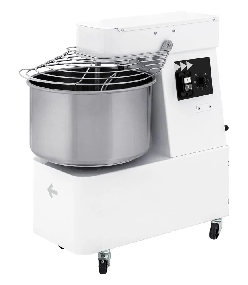 För professionellt bruk. Idealisk för pizzerior, bagerier, konditorier, dumplingbarer och donutbutiker för blandning av tunga degar. Stabilt och robust hölje i vitlackerat stål. Skål, skyddsgaller och spiral i AISI 304 rostfritt stål. Fast huvud och skål – enkel och beprövad konstruktion. Säkerhetsskydd med galler gör det enkelt att tillsätta ingredienser under drift. Med mikrobrytare som stoppar maskinen när skyddet lyfts. Kedjedrift säkerställer effektiv drift. Två hastigheter – den andra ger bättre hydrering och knådning. Tyst drift tack vare oljebadad växelmotor. Spiraldesign ger jämn och luftig deg utan uppvärmning. Inbyggd 30-minuters timer. Utrustad med 4 hjul, varav 2 med broms. Skålmått: Ø450 x (H)300 mm.