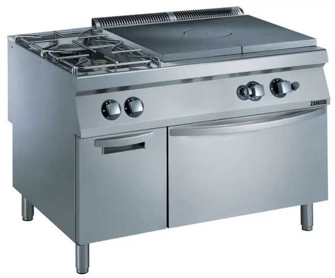 Gasspis slät hel häll (10,5 kW) med 2 öppna brännare (1×10 kW, 1×6 kW), gasugn (8,5 kW) och underskåp. Gasoldysor bifogas. Stadsgasdysor (206386) beställs separat.