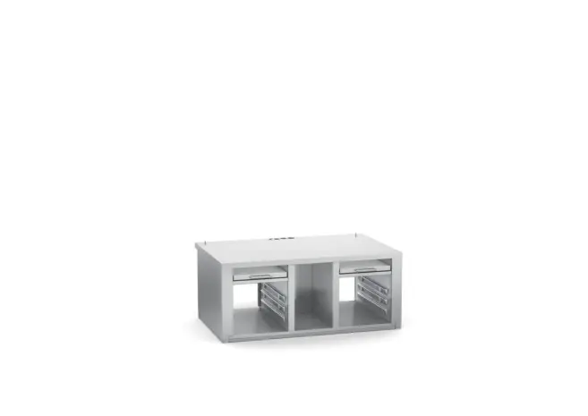 2 skjutbara hyllor, 6 par 1/1 GN (325 × 530 mm) skenor. Stängda sidoväggar och tak, öppen baksida, utan fötter.