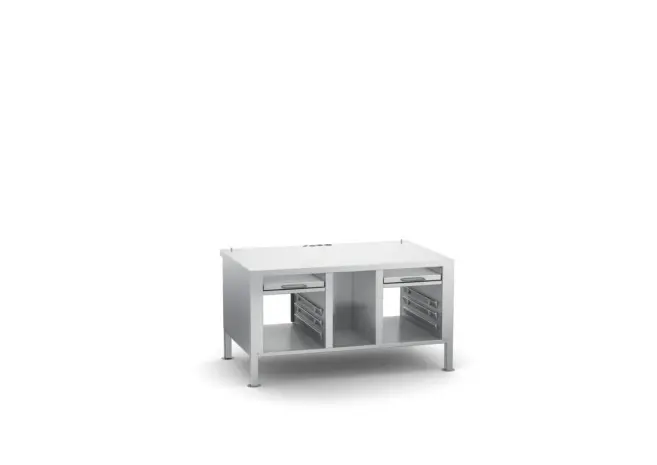 2 skjutbara hyllor, 6 par 1/1 GN (325 × 530 mm) skenor. Stängda sidoväggar och tak, öppen i rostfritt stål förberedda för fästen (ej justerbara).