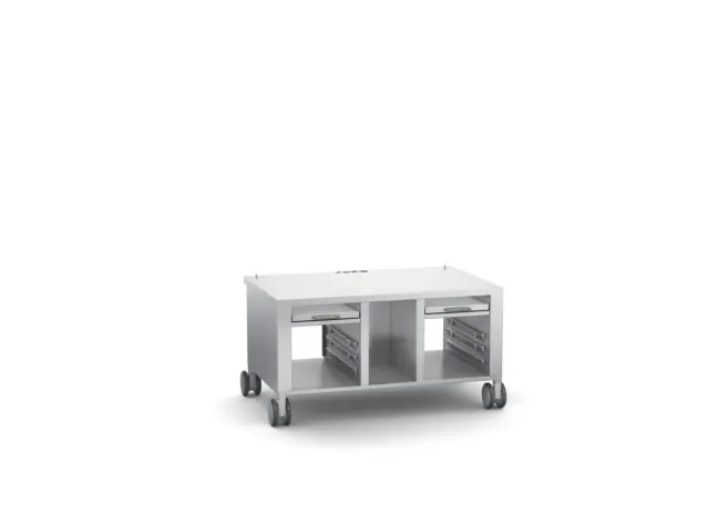 2 skjutbara hyllor, 6 par 1/1 GN (325 × 530 mm) skenor. Stängda sidoväggar och tak, öppen styrhjul med 125 mm diameter, varav 2 med spärr (ej justerbara).