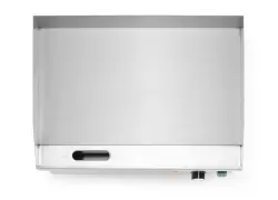 Stomme i rostfritt stål. Utrustad med stänkskydd. Levereras med löstagbar fettuppsamlingslåda. Temperaturen kan regleras steglöst upp till 300 °C. Överhettningsskydd med återställningsbar termosäkring. Försedd med halksäkra fötter. Stekytan mäter 548×350 mm och är helt slät. Den massiva 8 mm tjocka härdade stålplattan ger utmärkt värmelagring.