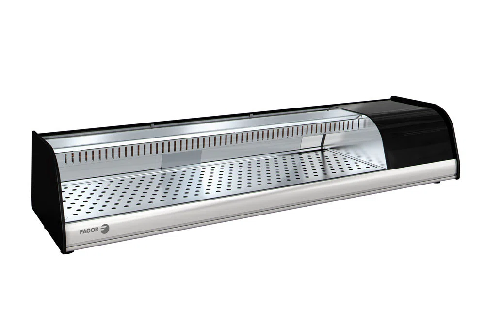 Sushidisplaykyl från Fagor. Temperatur -1, +2. Eletronisk termostat för temperaturkontroll. Skärmat inre belysningssystem. Mått: 1380x415x278 mm. 105W. R-600a.