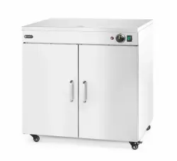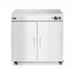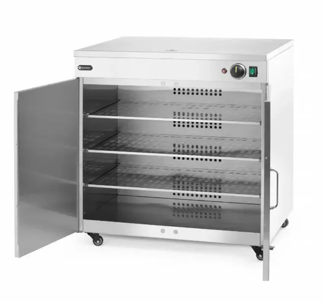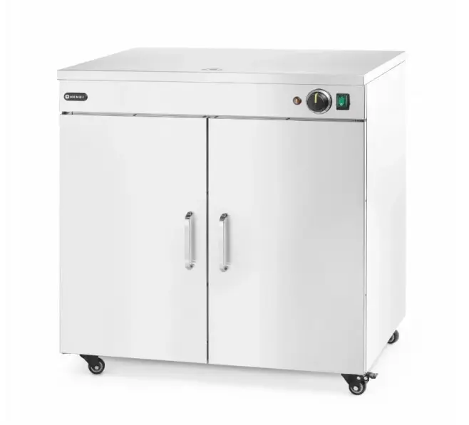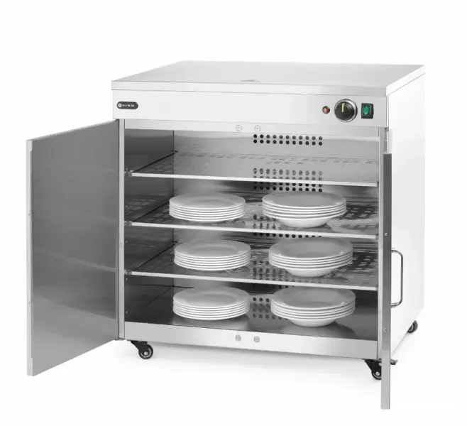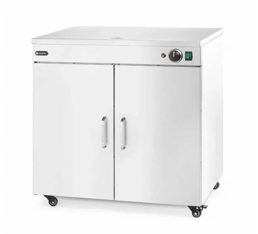 Tallriksvärmare Dubbel från Hendi håller upp till 108 tallrikar med en diameter på 24 cm (eller 64 pizzatallrikar med en diameter på 33 cm) varma och redo att serveras samtidigt. Denna tallriksvärmare säkerställer att maten behåller sin temperatur från köket till kundens bord, samtidigt som alla smaker bevaras. Perfekt för restauranger, kantiner och cateringevent där stora mängder måltider förbereds och serveras på en gång.