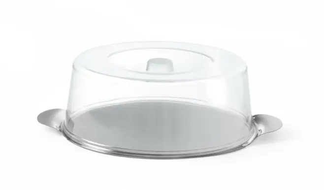 Snyggt tårtfat i rostfritt stål med genomskinlig kupa i plast. Mått: ø300x(H)110 m.m. Tårtfatet har praktiska handtag. Både tårtfatet och kupan går att diska i diskmaskin.
