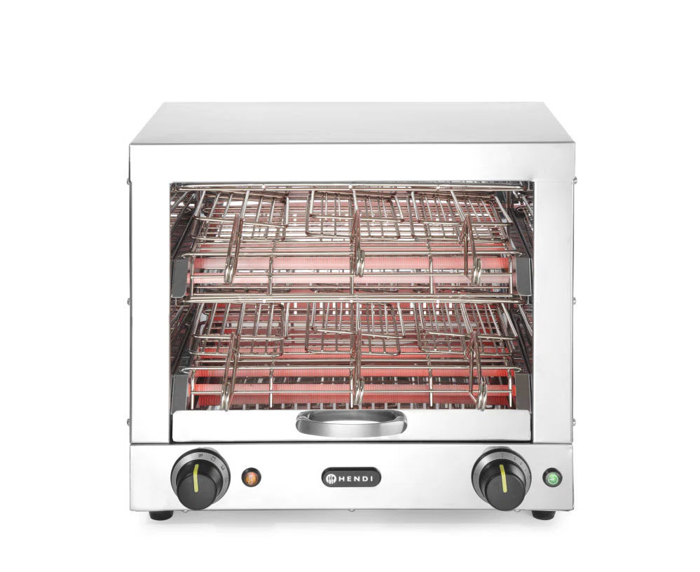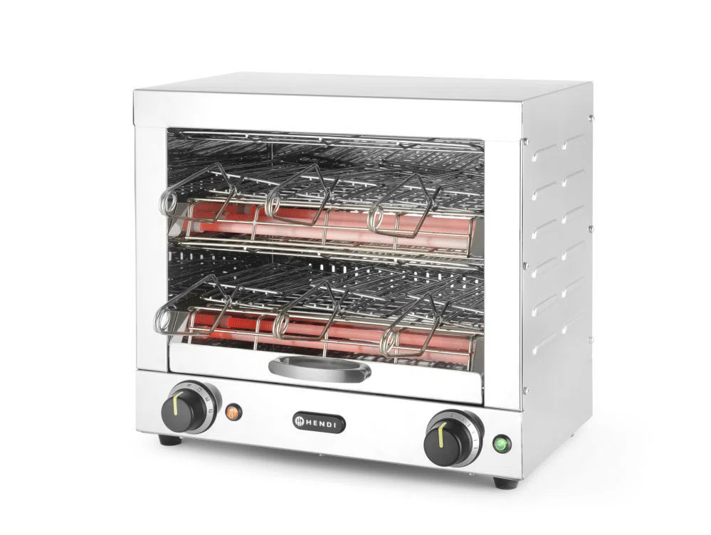 2 Layers with 6 toaster tongs – stainless steel. Infrared quartz tubes for prompt heating, temperature can reach maximum within 30 seconds. Tubes cool down in seconds. Switch for selecting different heating groups. 15 Minutes mechanical timer with bell. 6 Toaster tongs included.