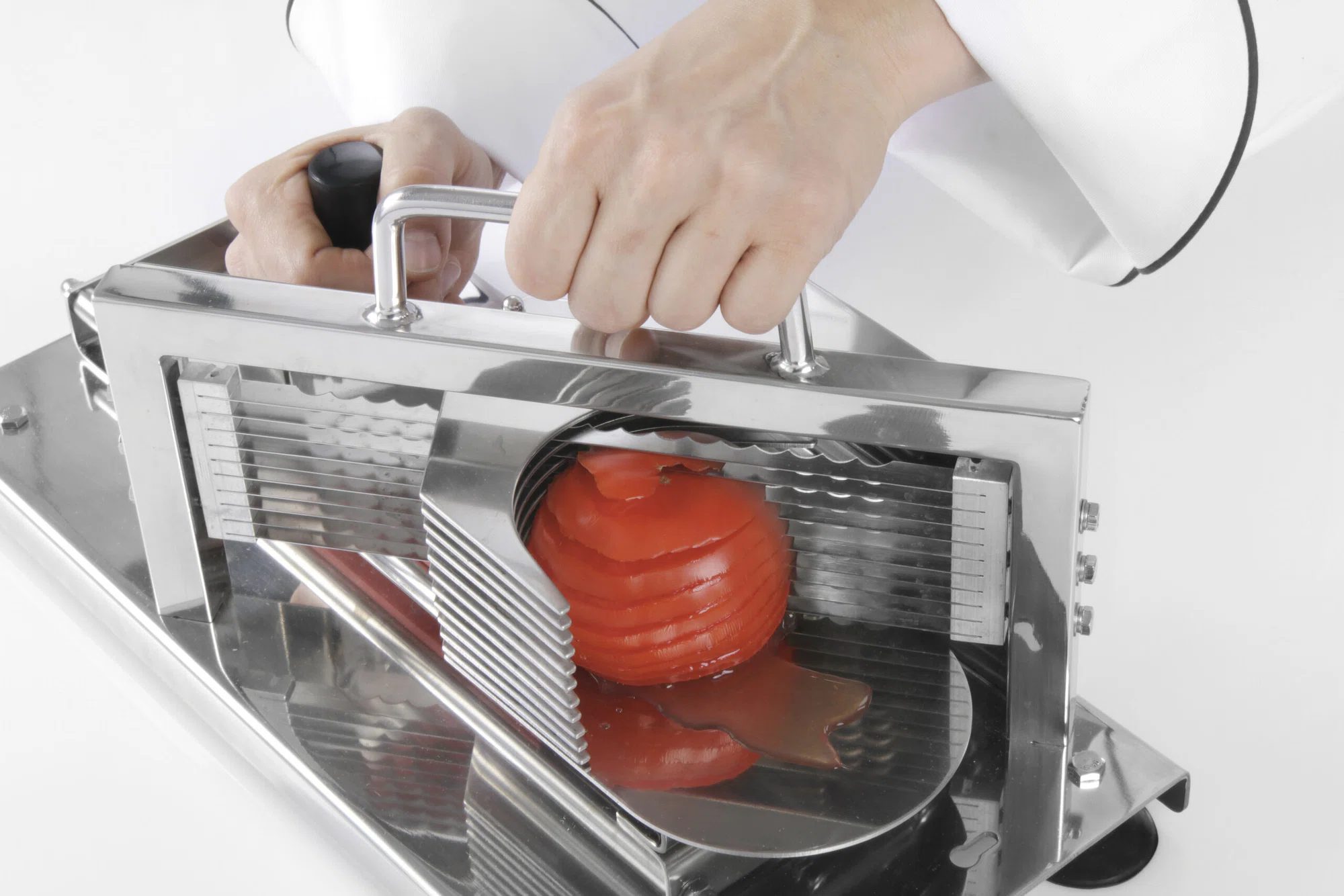 Endast för att skära tomater eller mjuka grönsaker / frukter. Tjocklek på skivor ± 5 mm. Lätt att rengöra. Med sugkoppsfötter. Skruvdragningsverktyg som hex-skiftnyckel ingår inte. Rostfritt stål.