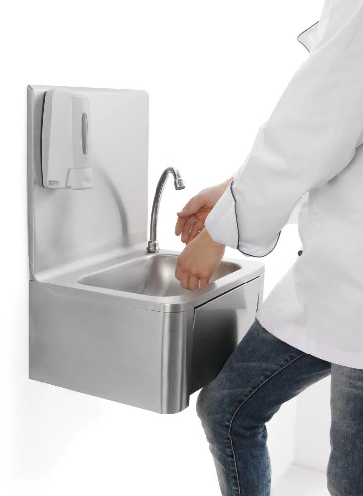With knee-operated faucet and soap dispenser. 1/2″ water connection. Basin and backsplash made of 18/10 stainless steel.