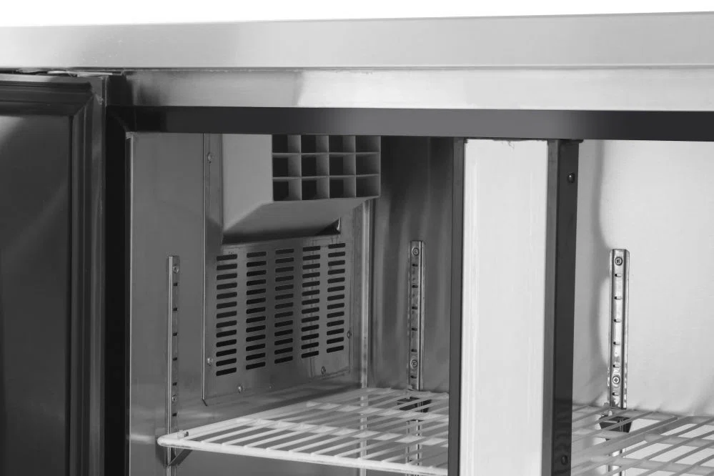 Inner and outer housing are made of high-quality stainless steel Self-closing doors fitted with comfortable handles. Work surface fitted with a 40 mm high ridge at the back. Forced air cooling with auto-defrost, compressor placed underneath the chamber. 50 mm thick polyurethane foam insulation. With adjustable shelving. Digital display and electronic thermostat. With 4 adjustable stainless-steel feet. Climate class: SN-ST. Coolant: R600a.