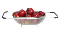 Helt tillverkad av rostfritt stål AISI 201. Utdragbara handtag, halkfria – täckta med gummi. Stödben för att placera den direkt i diskhon. Finmaskigt. Justerbar till max. diskbänkens bredd: 545 mm. Kan diskas i diskmaskin.