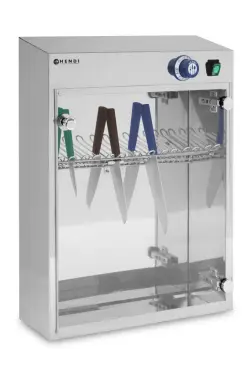 Perfect for sterilizing knives, capacity for 14 knives. Made of stainless steel with plexiglass door. Fitted with stainless steel knife holder. Sterilizes by means of bactericidal ultraviolet light. Equipped with a microswitch to prevent operation while the door is open. Integrated timer adjustable up to 60 minutes.