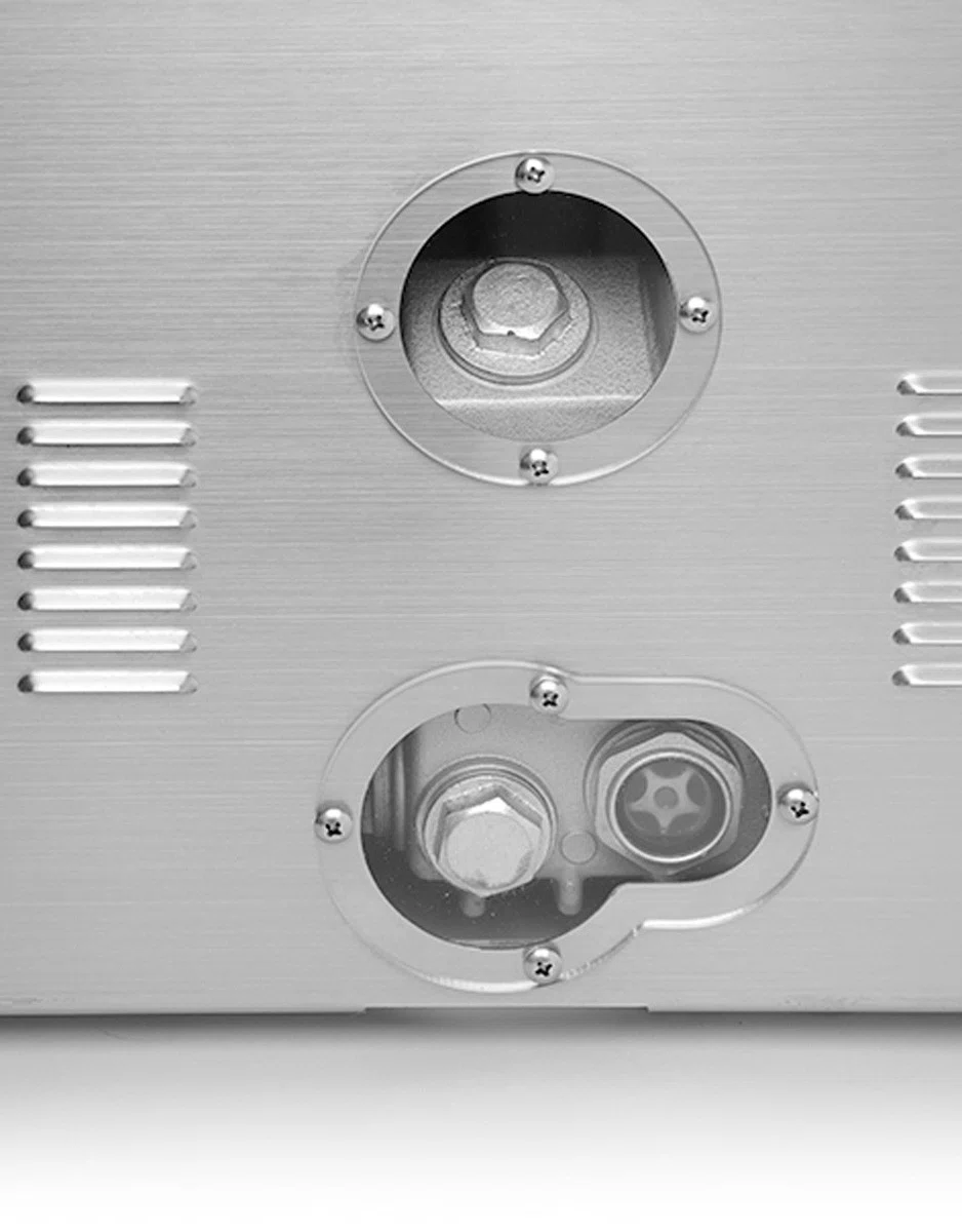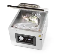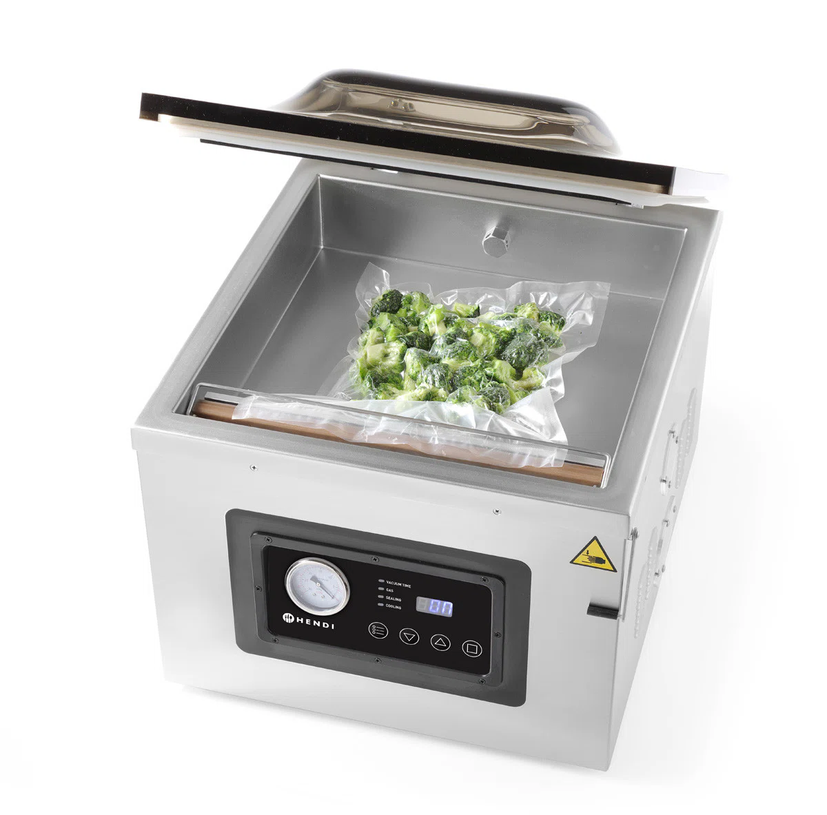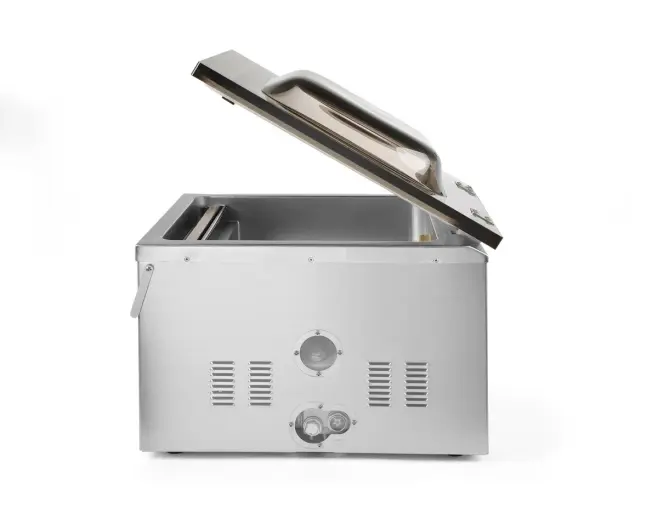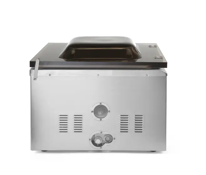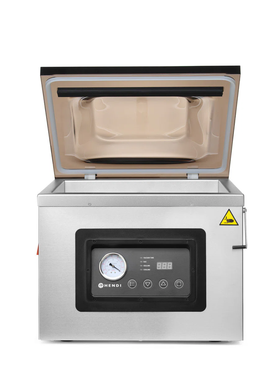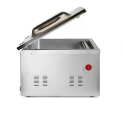 410 mm seal strip, sealing bar width: 3 mm. Adjustable vacuum, sealing, inflating and cooling time, automatic and manual operation. Suitable for vacuum packing liquid and wet food. Fitted with a digital display and a manual pressure gauge. High quality oil pump which provides high pressures (1009mbar) and fast vacuum speed. Body and chamber made of high quality stainless steel. Large recess in the bottom and domed transparent cover allow for packing large portions. With bag clamp inside the chamber to keep bags in place during operation. Oil cooled pump, capacity: 333,3 L/min. Chamber dimensions: 425x457x(H)100 mm