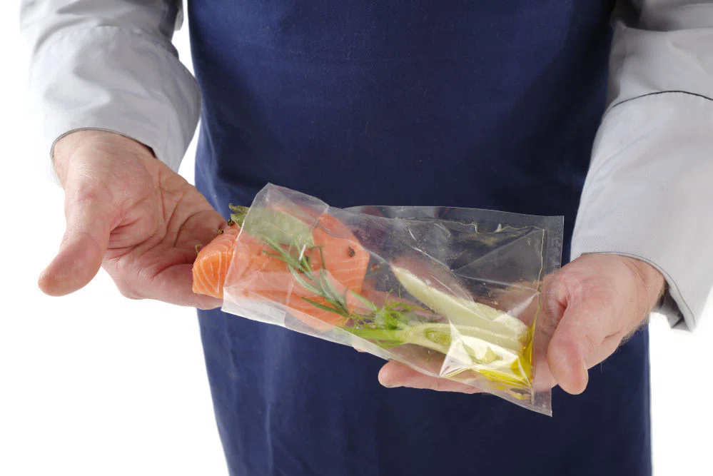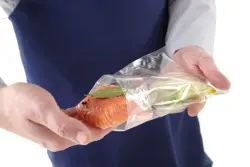 2-ply, inside layer made from food contact approved Polyethylene, outside layer made from Polyamide (Nylon). Total thickness is 65 µm. Suitable for chamber vacuum packing machines.