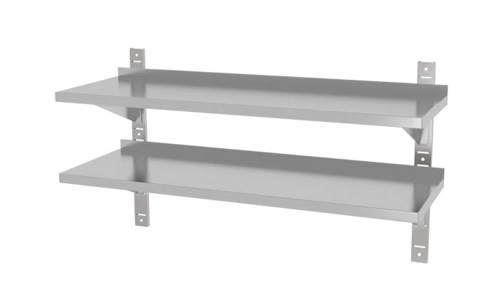 Solid dubbel vägghylla 1400x300x600mm. Tål belastning om 25kg/m2. Tillverkad i AISI430 rostfritt stål.