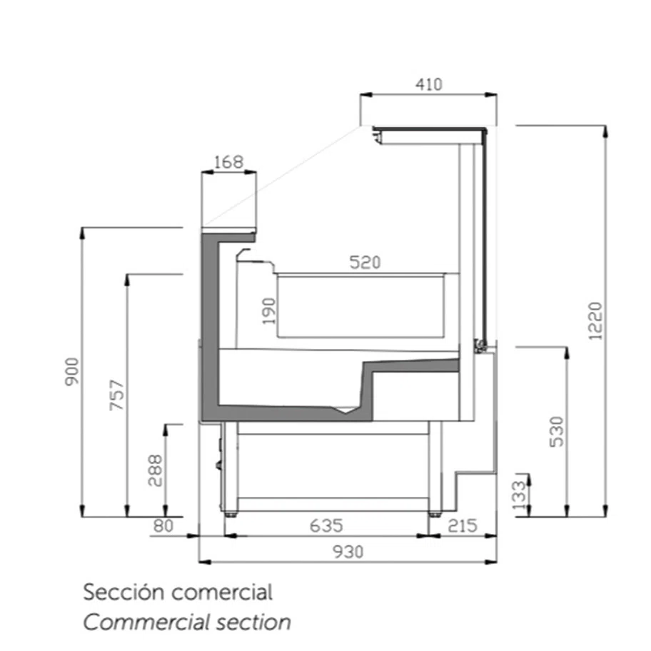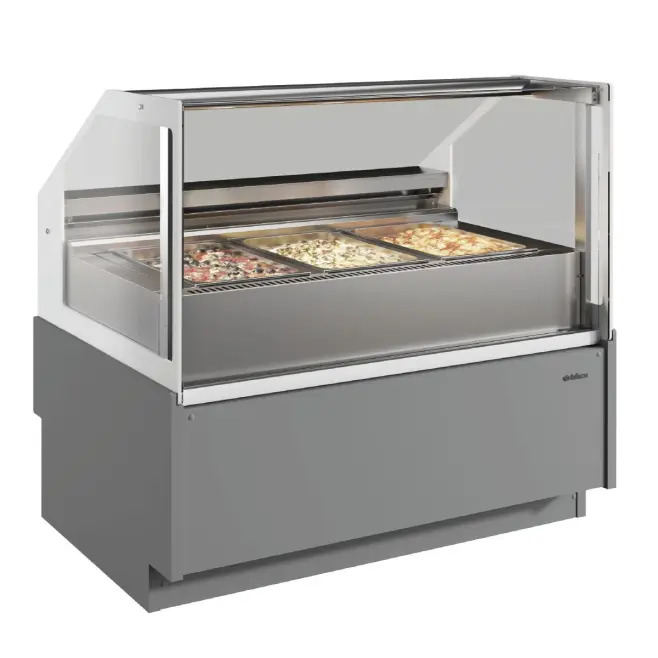 Design för traditionella serveringsskåp för kylda produkter och sallader för självbetjäning.