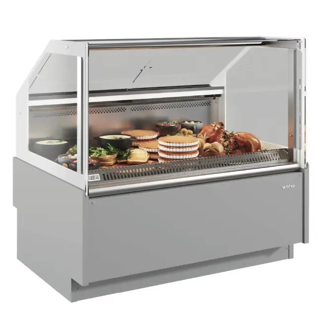 Design för traditionella serveringsskåp för kylda produkter och sallader för självbetjäning.