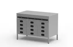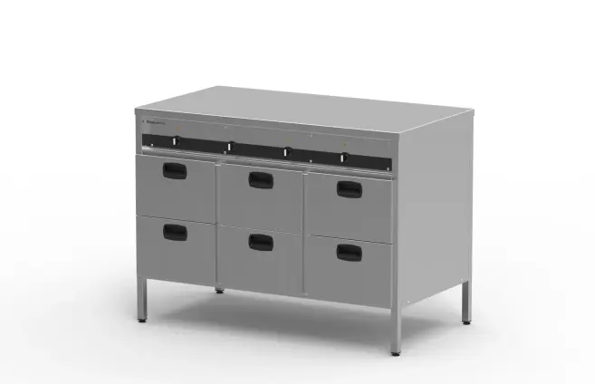 Kantinerna placeras i en ram som vilar på kullagrade, dubbelverkande rostfria expansionsbeslag. Ramen är enkelt urlyftbar för rengörning. Lådorna med kantiner kan dras ut i kantinens fulla längd. Konstruktionen av lådorna är tättslutande varför tätningslist inte är nödvändig. Temperaturregleringen mellan 50 till 110 grader är separat för varje skåprad, med termostater i panelen.