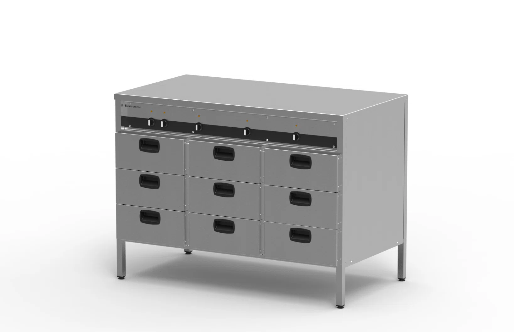 Hurtsen är tillverkad i rostfritt material. I den stabila underhyllan är fyra fyrkantsrör insvetsade. I dessa rör är sidoplåtar, fronter och innerskåp fästade. Ryggplåten är skruvad för enkel installation och service. Värmeelementen är monterade i bottenplåten. Hurts med varmtopp har en fem mm tjock värmefördelningsplatta under den rostfria topplåten i vilken elementen är fästade. Detta ger en mycket jämn temperatur över hela ytan. För injustera av hurtsen fi nns fyra ställbara fötter. Kapslingsklass IP43, skyddsklass I.