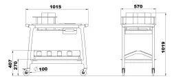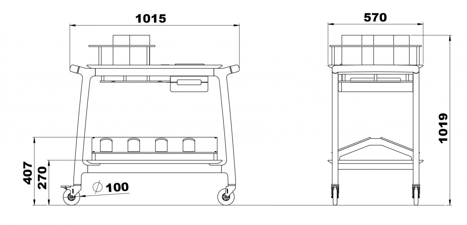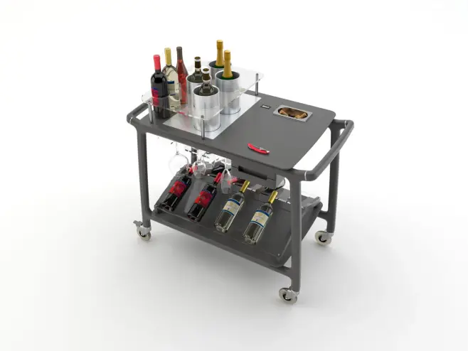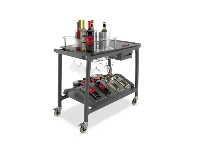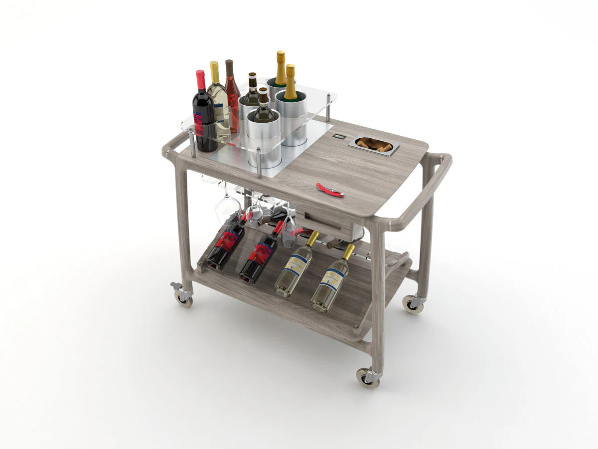 Vacker vinserveringsvagn i massivt trä för visning av vinflaskor med lådor, glasställ, korkskål och en lägre nivå med särskild struktur för visning av flaskor.