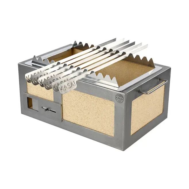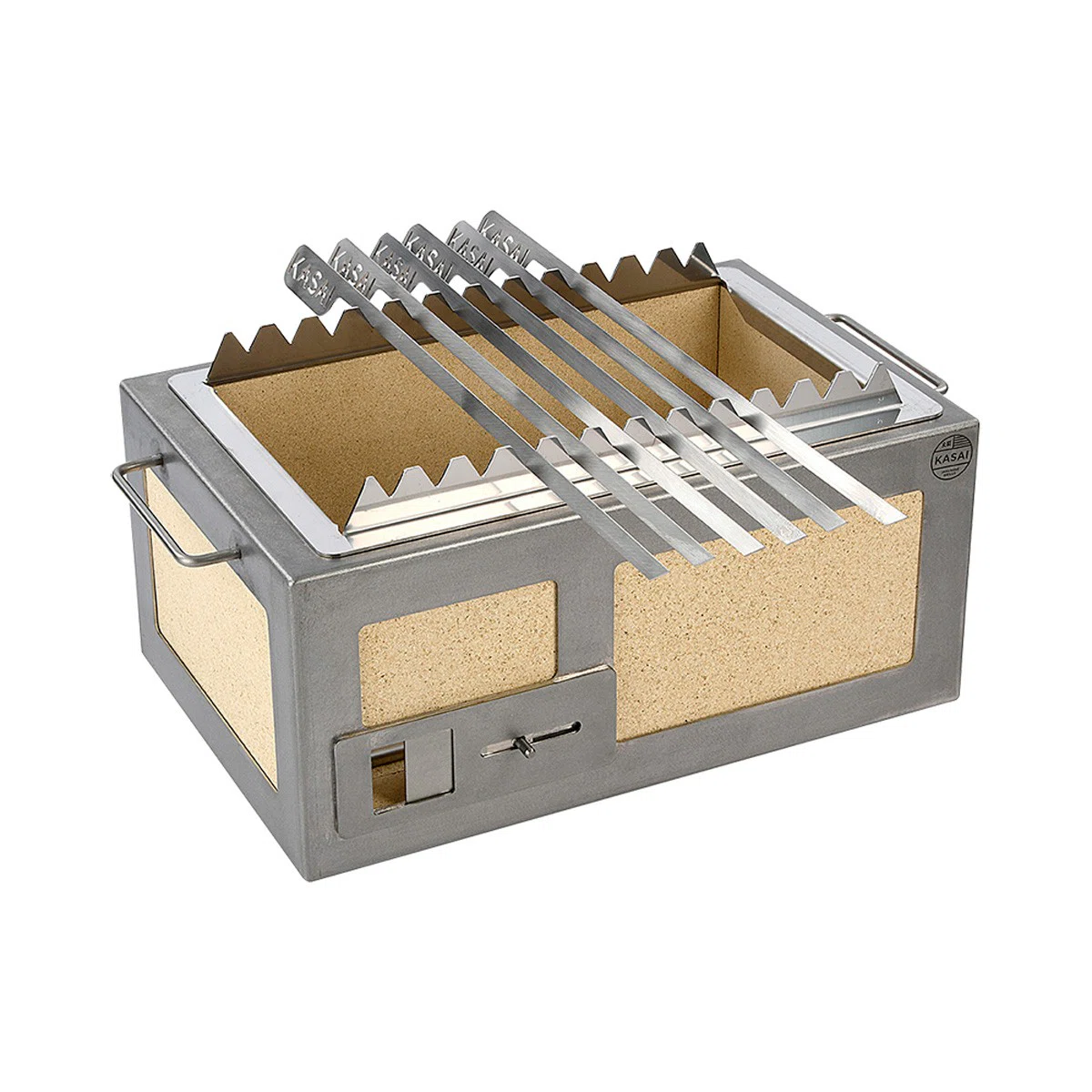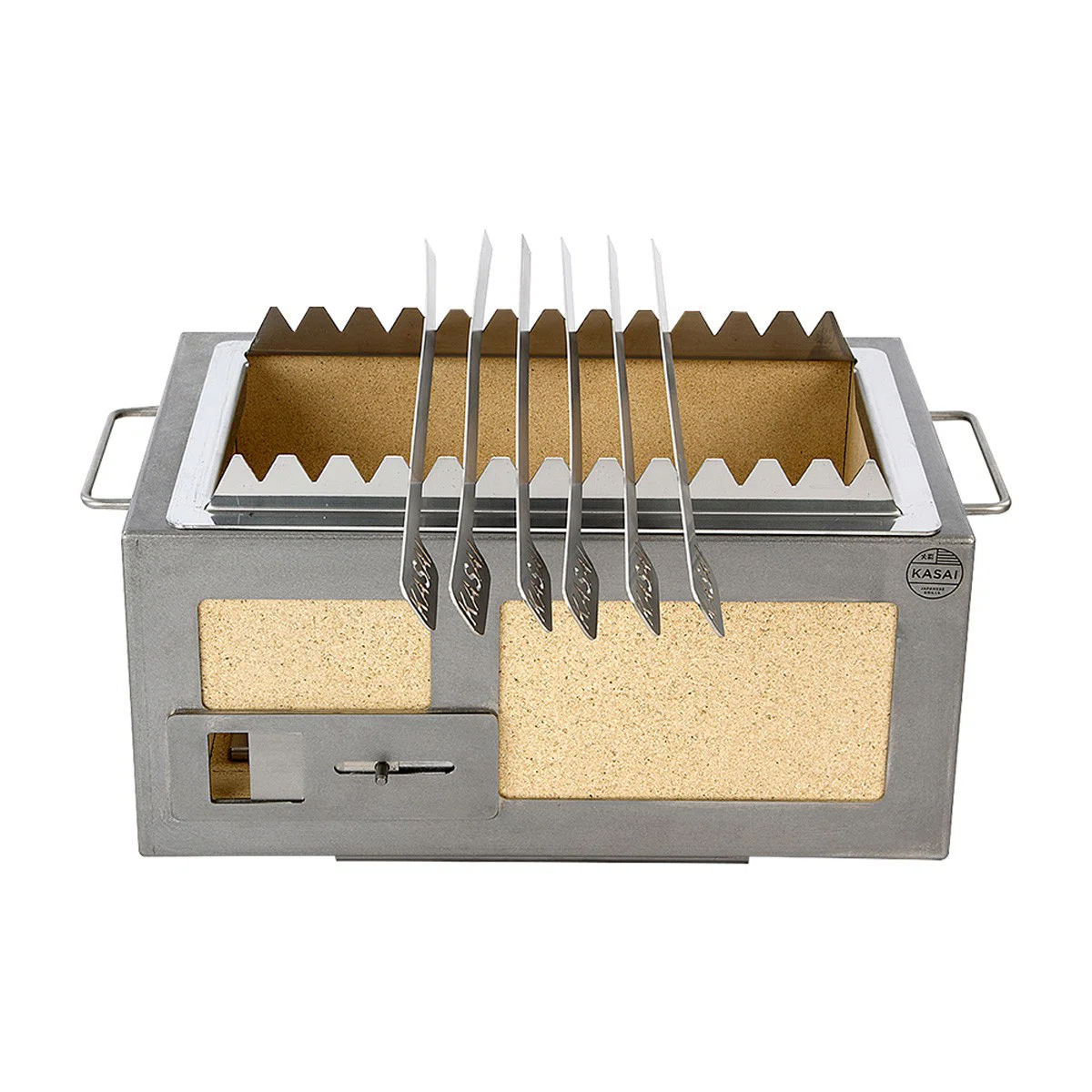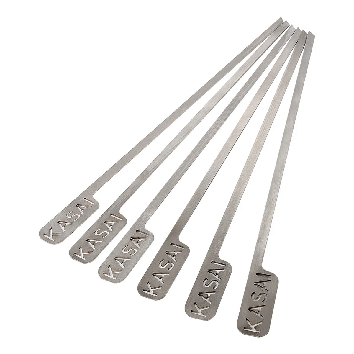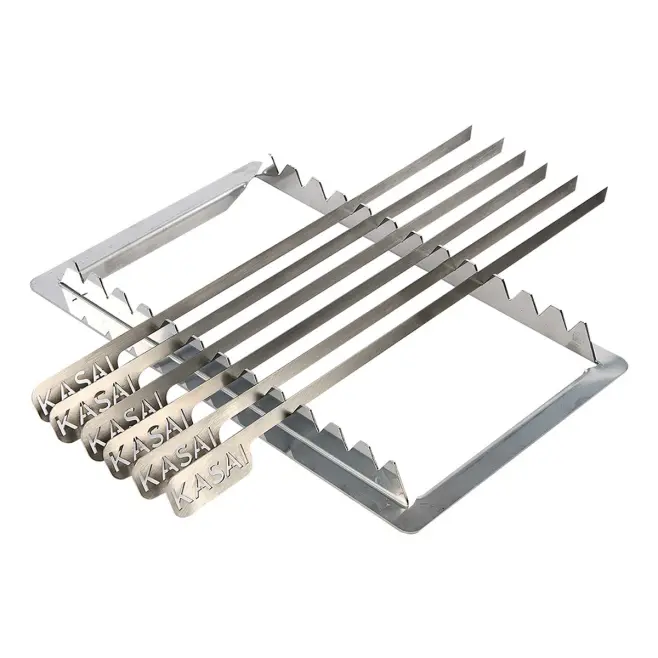 Konro Yakatori rack till Kasai Small levereras med 6 grillspett med handtag i rostfritt stål. De är perfekta för att grilla allt från kryddat lamm till livfulla grönsaker och gnisslande halloumi. Du behöver inte lyfta spetten från grillen för att vända dem, utan bara sätta i maten på spetten, fästa dem i ramen och vrida dem 360 grader för att säkerställa jämn tillagning.