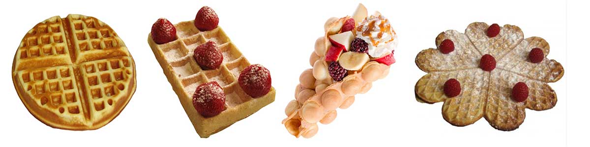 Klassiska hjärtanformade våfflor, belgiska våfflor, bubbelvåfflor, amerikanska våfflor, churros våfflor.